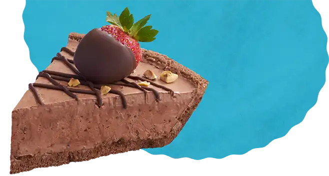 Chocolate Pie Crust, rich frozen chocolate mousse, topped with chopped hazelnuts, chocolate-dipped strawberries and drizzled with melted chocolate.