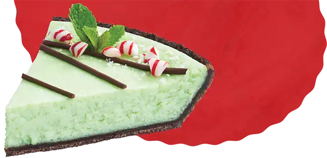 Rich mint cheesecake filling, baked into a mint chocolate pie crust, drizzled with chocolate, and topped with crushed peppermint candy and fresh mint leaves.